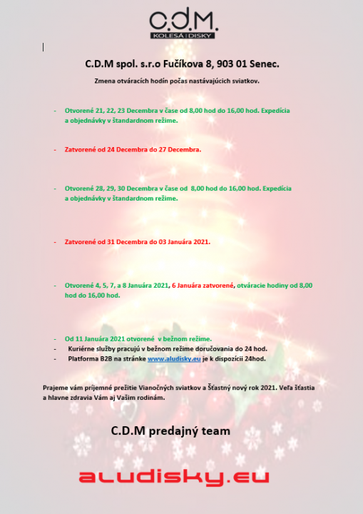 Otváracie hodiny počas nastávajúcich Vianočných sviatkov a Nový rok 2021. Vážení obchodní partneri, ďakujeme vám za prejavenú dôveru v roku 2020, želáme veľa šťastia a hlavne zdravia v roku 2021. Team CDM.