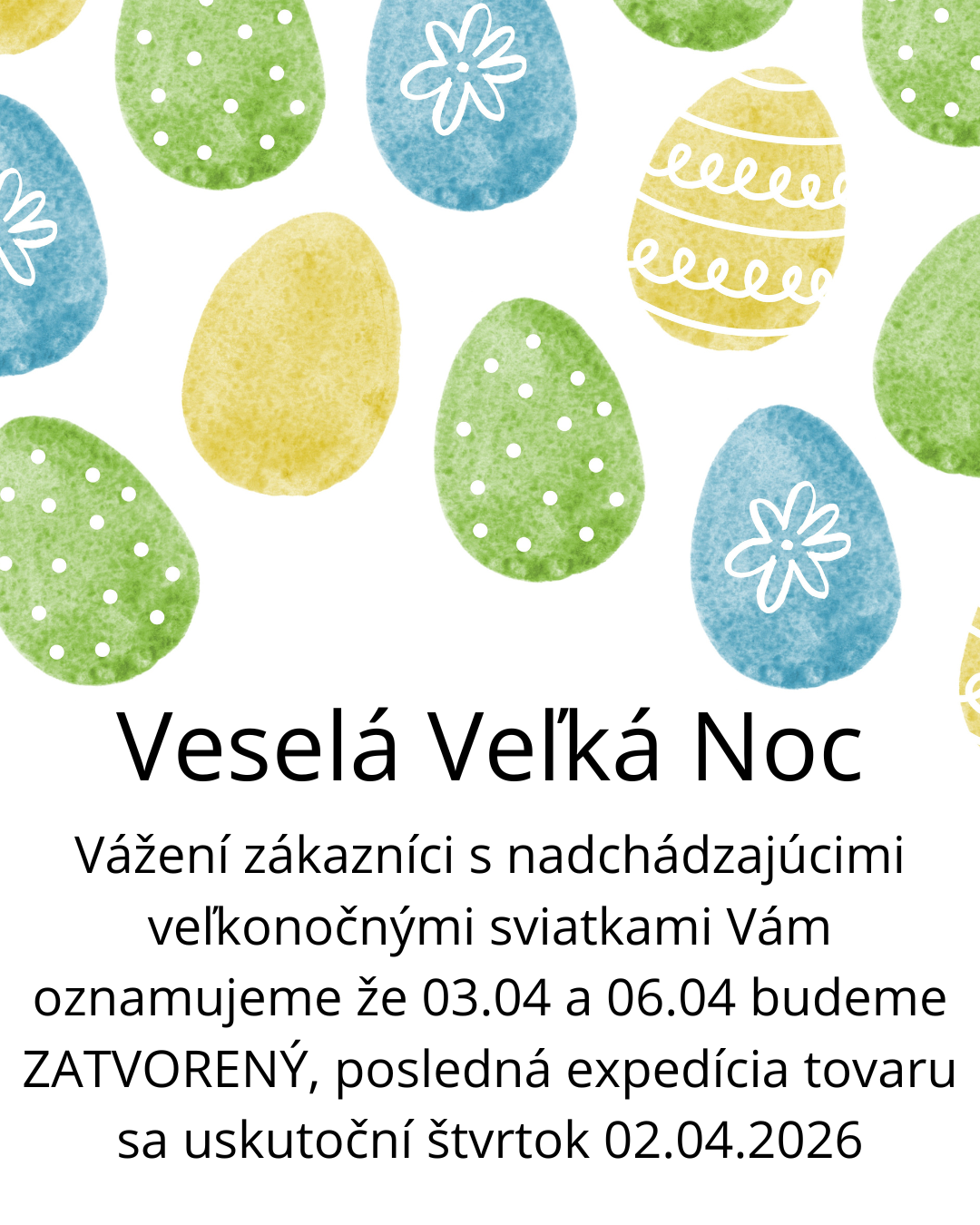 a oznámili že v piatok 03.04 a pondelok 06.04 budeme z dôvodu štátnych sviatkov ZATVORENÝ.